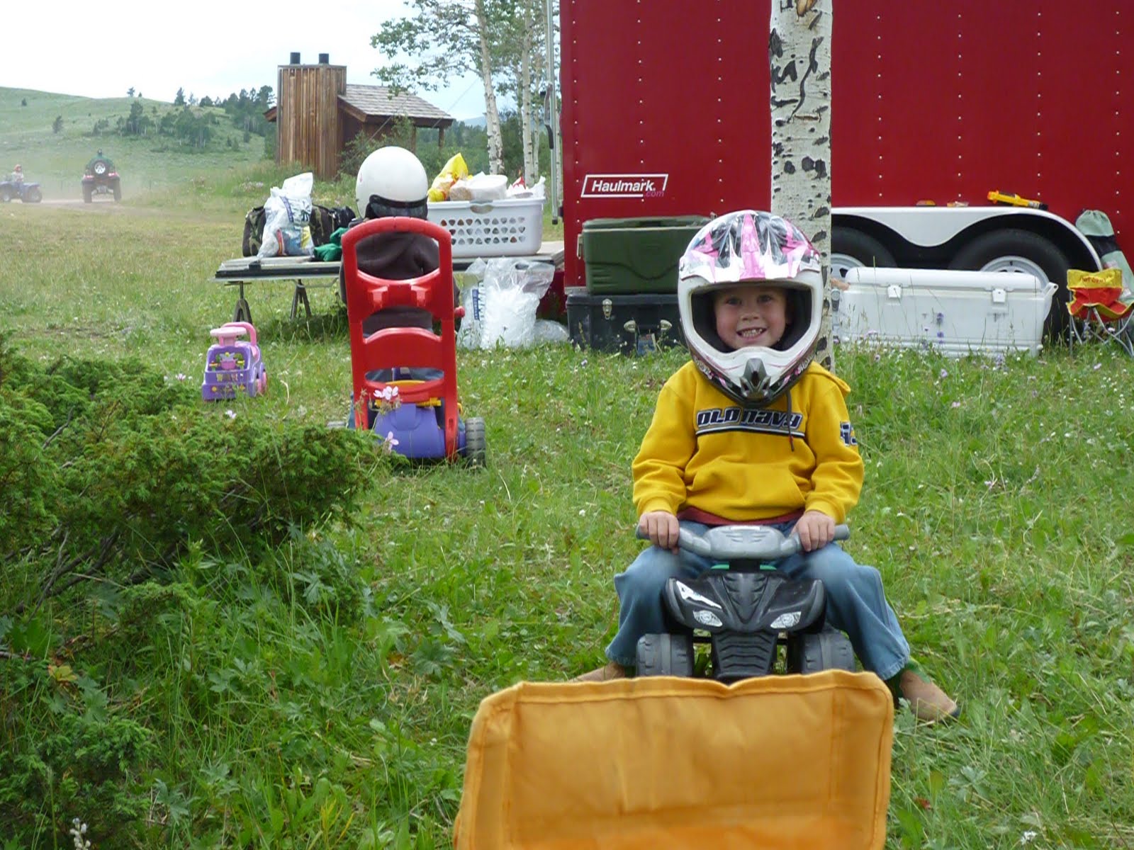 Jace having fun riding Cades push 4 wheeler